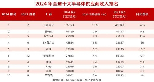 美光同样是英伟达HBM的供应商之一,去年收入同比增长72.7%,一举攀升到全球第六。