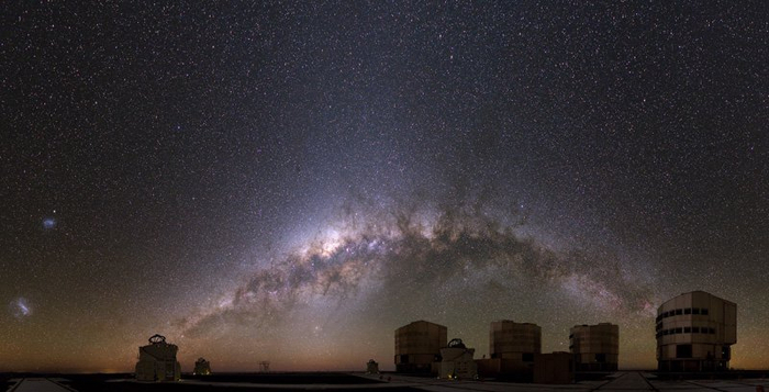 智利阿塔卡马沙漠安托法加斯塔地区的帕拉纳尔天文台,是欧洲南方天文台(ESO)三大观测地之一,图中是其中四台望远镜,背景为银河。几公里之外,中国正在推进文塔罗内斯天文台的建设。 资料图