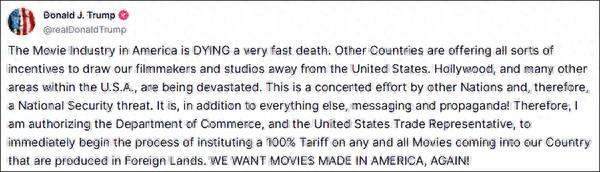 特朗普声称,美国的电影业正在“迅速消亡”,其他国家正在提供各种各样的激励措施,以吸引电影制作人和工作室离开美国。“好莱坞和美国的许多其他领域正遭受重创。这是其他国家共同筹划的行动,构成了对国家安全的威胁,”他写道,“我们要电影再次在美国制作!”