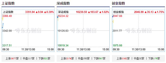 5月12日,A股三大指数集体高开。上证指数高开0.33%,报3352.97点;深证成指高开0.92%,报10220.33点;创业板指高开1.55%,报2042.90点。