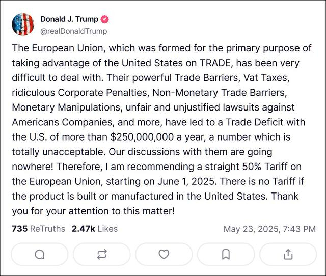 特朗普还表示,美国与欧盟的谈判毫无进展,“因此,我建议从2025年6月1日起对欧盟产品直接征收50%的关税。如果产品在美国制造或生产,则无需缴纳关税。”