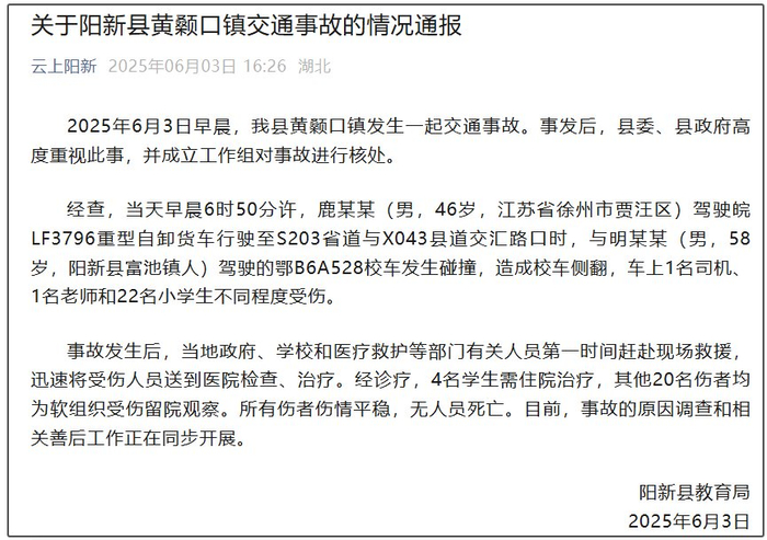 2025年6月3日早晨,我县黄颡口镇发生一起交通事故。事发后,县委、县政府高度重视此事,并成立工作组对事故进行核处。