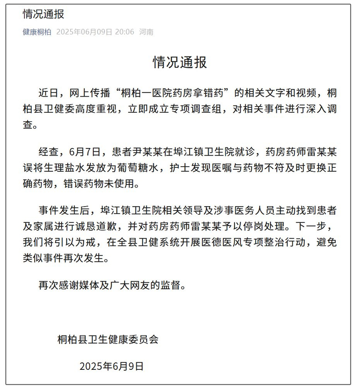 微信公众号“健康桐柏”消息,6月9日,河南桐柏县卫生健康委员会发布情况通报: