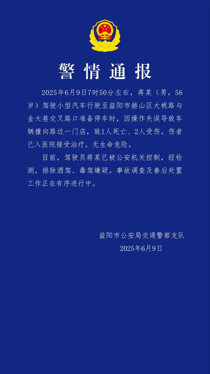 2025年6月9日7时50分左右,蒋某(男,56岁)驾驶小型汽车行驶至益阳市赫山区大桃路与金大巷交叉路口准备停车时,因操作失误导致车辆撞向路边一门店,致1人死亡、2人受伤。伤者已入医院接受治疗,无生命危险。