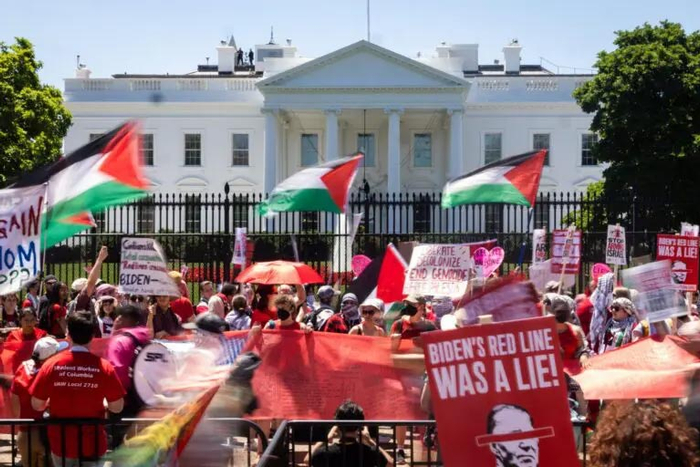2024年6月8日,数千名亲巴勒斯坦抗议者当天聚集在白宫周围,敦促拜登停止对以色列的一切军事援助,并呼吁以色列立即停止在加沙的战争行为。视频截图