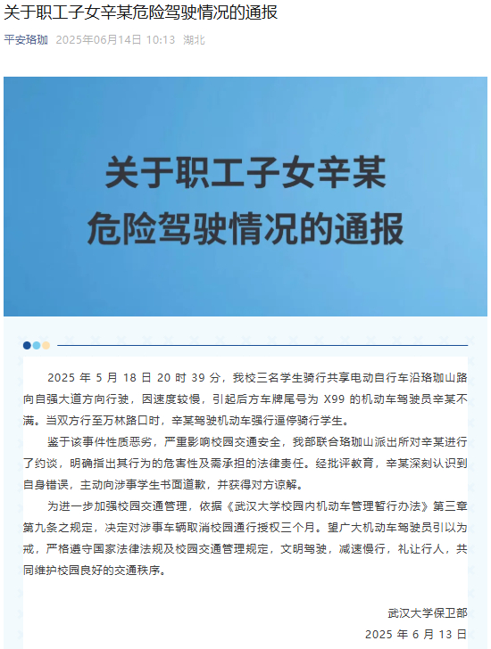 据武汉大学官方微信公众号“平安珞珈”6月14日消息,武汉大学保卫部发布关于职工子女辛某危险驾驶情况的通报: