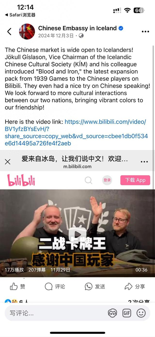 1939 Games和中国有着很深的渊源。如上所述,我们团队里有来自中国的开发者,还有对中国文化非常感兴趣的冰岛开发者,他目前还担任冰中友好协会副主席一职,为两国的文化交流做出了很多贡献,这位老伙计的照片甚至还在中国外交部的官方网站上出现过。去年11月冬季扩展更新的时候,我们在B站发布了一个用中文和中国社区玩家打招呼的视频,收到了非常积极的社区反馈,还意外得到了中国驻冰岛大使馆官方的关注和报道。