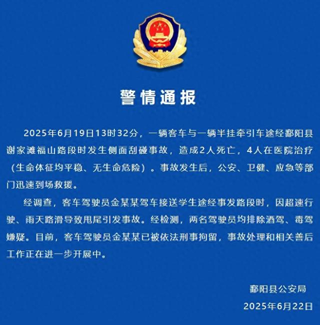 据“平安鄱阳”微信公众号6月22日通报,2025年6月19日13时32分,一辆客车与一辆半挂牵引车途经鄱阳县谢家滩福山路段时发生侧面刮碰事故,造成2人死亡,4人在医院治疗(生命体征均平稳、无生命危险)。事故发生后,公安、卫健、应急等部门迅速到场救援。