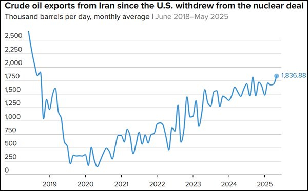 2018年美国单方面退出伊核全面协议以来,伊朗原油出口量变化趋势图 美国消费者新闻与商业频道(CNBC)制图报道认为,特朗普态度的转变发生在伊以达成停火协议后不久,也正值美国与中国刚敲定新的贸易框架、从关税战中撤回之际,似乎是想对中国、对伊朗“抛出诱饵”,让他们分别与美国进行谈判。