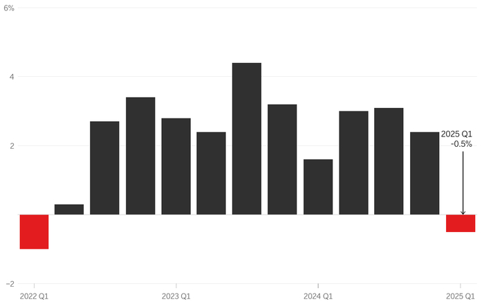 美商务部数据显示,今年一季度美国GDP出现下滑,扭转了2024年最后一个季度2.4%的增长,标志着该国经济三年来首次出现萎缩。其中,美国进口增长37.9%,为2020年以来最快增速,拖累GDP下降近4.7个百分点。