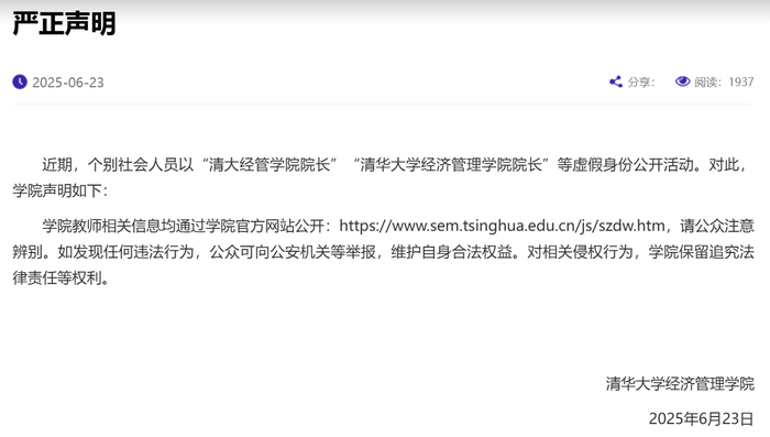 据清华大学经济管理学院网站消息,6月23日,清华大学经管学院曾发布严正声明称,近期,个别社会人员以“清大经管学院院长”“清华大学经济管理学院院长”等虚假身份公开活动。对此,学院声明如下: