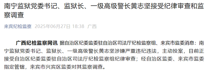 南宁监狱党委书记、监狱长、一级高级警长黄志坚涉嫌严重违纪违法,主动投案,目前正接受自治区纪委监委驻自治区司法厅纪检监察组纪律审查;经自治区监委、来宾市监委指定管辖,来宾市兴宾区监委对其监察调查。
