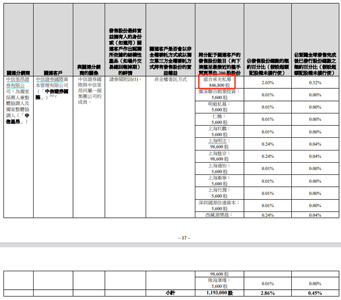 值得注意的是,在IFBH 6月27日发布的《最终发售价和配发结果公告》中,农夫山泉创始人钟睒睒旗下道合承光私募等投资机构在“打新”中拿到84.68万股的股份(钟睒睒持有该基金30%或以上权益)。以IFBH以27.8港元招股价上限为定价,道合承光的“打新”成本投入约为2353.5万港元。