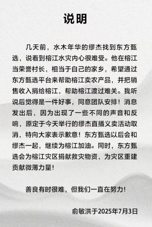 7月3日上午,新东方创始人俞敏洪就东方甄选与水木年华成员缪杰义卖直播取消一事发布了一份声明,并为此道歉。