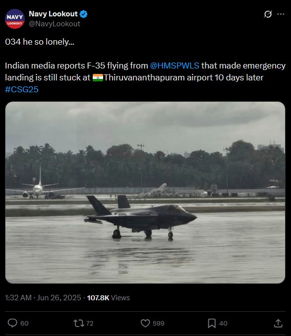 不过,英国人就不那么乐见F-35B滞留带来的热度了。“一架最先进的英国战斗机已在印度的一座机场滞留近三周,引发外界好奇,也有声音质疑为何如此现代化的飞机会在外国滞留多日。”BBC写道。