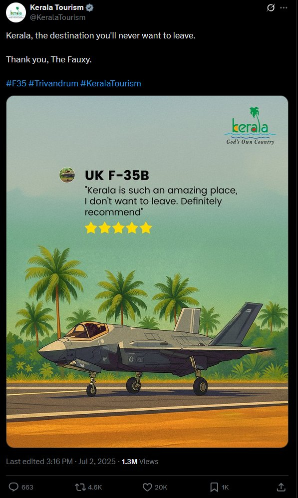 到了7月2日,喀拉拉邦旅游部也加入调侃大军,分享了一张AI生成的“宣传海报”,配文“喀拉拉邦,一个让你流连忘返的地方”。海报上,一架F-35B停在椰树环绕的跑道上,文字是以F-35B口吻写的一句五星好评:“喀拉拉邦是一个神奇的地方,我都不想离开了。绝对推荐。”