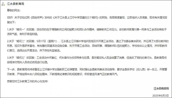 6月3日,江永县教育局回应称,团建活动目的在于增强教师之间的凝聚力和团队合作精神,缓解教师工作压力。该校教师家属付费一同参与工会活动有助于活跃气氛,有利于家庭和睦。