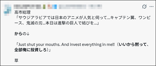 据日本《读卖新闻》报道,当地时间12月1日,在东京一场由沙特主办的国际投资会议上,日本首相高市早苗一上台就迫不及待般地对台下沙特投资人来了一段“文化导论”:“我听说啊,日本的漫画、动画在沙特特别火,对吧?”