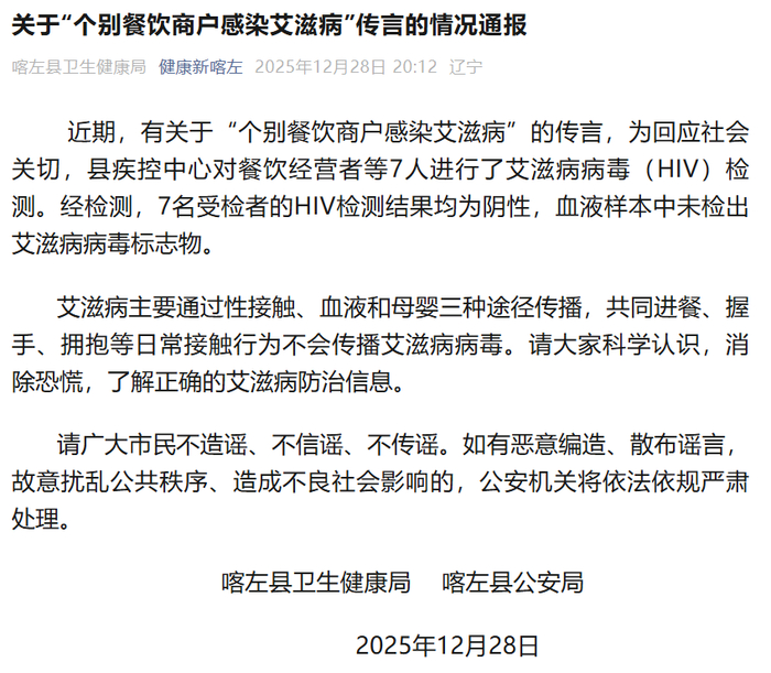 据辽宁喀左县卫生健康局微信公众号“健康新喀左”消息,12月28日,喀左县卫生健康局、喀左县公安局发布关于“个别餐饮商户感染艾滋病”传言的情况通报: