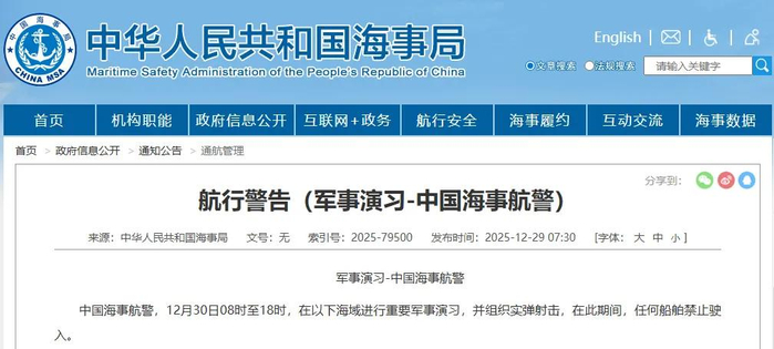 中国海事局网站29日发布中国海事航警,12月30日08时至18时,在以下海域进行重要军事演习,并组织实弹射击,在此期间,任何船舶禁止驶入。