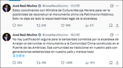 仅3小时后,穆利诺进一步宣布,“巴拿马政府已与文化部展开协调,正考虑以历史遗产名义恢复华人纪念碑的可行性。但这些补救措施并不能免除阿赖汉市市长应承担的法律责任。”
