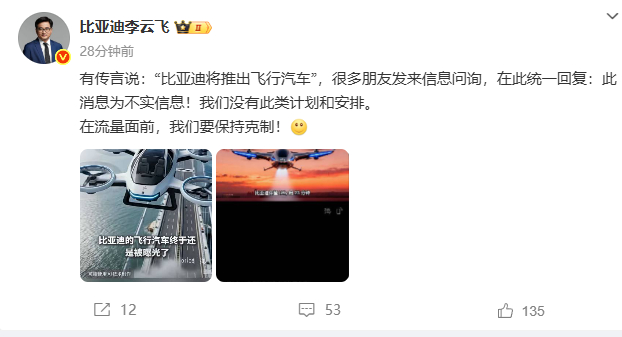 12月29日,比亚迪集团-品牌及公关处总经理李云飞在微博平台上,回应了“比亚迪将推出飞行汽车”的传言,称此消息为不实信息。