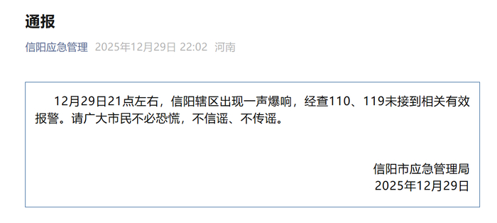 12月29日21点左右,信阳辖区出现一声爆响,经查110、119未接到相关有效报警。请广大市民不必恐慌,不信谣、不传谣。