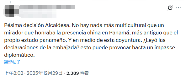 在这则帖文的评论区,许多网民都持反对态度,直指这根本不是“预防措施”,而是“彻底拆除”,抹去了巴拿马与当地一个重要社区的历史性地标,令人无法接受,必须公开道歉并修复。还有人直言,中国人在巴拿马的历史(1854年)比巴拿马建国(1903年)本身还要悠久,没有什么比尊重中国人在巴拿马的历史更能体现“多元文化”,这位网民还担忧,此事件可能引发中巴两国的外交僵局。