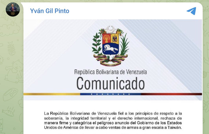 委内瑞拉外交部长伊万·希尔通过telegram账号发布的声明指出,美国宣布向台湾地区大规模出售武器这一单边举措,不仅是对中国内政的严重干涉,更是公然违背自身作出的国际承诺,直接损害中国的主权与领土完整,破坏地区战略稳定,对亚太地区的和平与安全构成赤裸裸的威胁。
