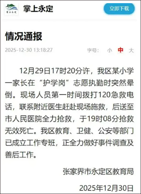 12月30日,湖南张家界市永定区教育局通过“掌上永定”客户端发布情况通报称: