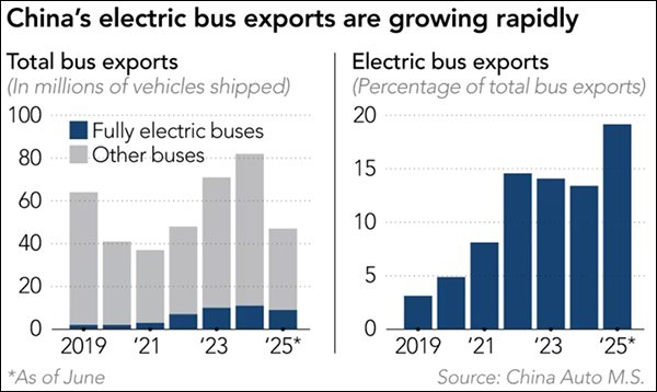 2019年至2025年,中国公交车(左)和电动巴士(右)出口数据图 《日经亚洲》制图根据中国汽车资讯媒体的数据,仅在2025年上半年,中国就向全球出口约9000辆纯电动巴士,同比激增124%。日媒指出,尽管目前东南亚在其中占比不高,但区域需求的持续增长有望改变这一局面。