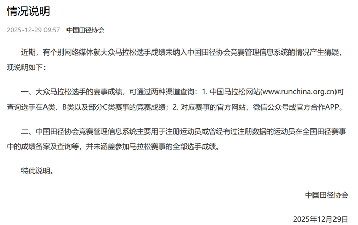 近期,有个别网络媒体就大众马拉松选手成绩未纳入中国田径协会竞赛管理信息系统的情况产生猜疑,现说明如下: