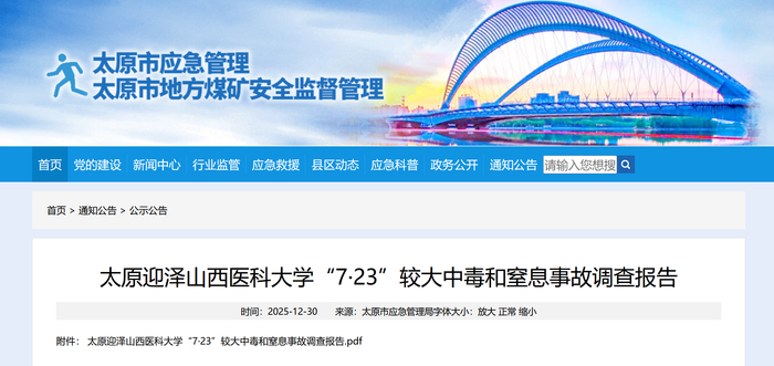 12月30日,太原市应急管理局网站发布《太原迎泽山西医科大学“7·23”较大中毒和窒息事故调查报告》。