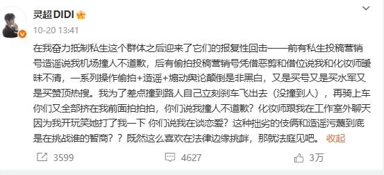 10月,灵超曾喊话私生粉法庭见,称被私生粉报复性回击,包括偷拍、造谣、煽动舆论颠倒是非黑白等。