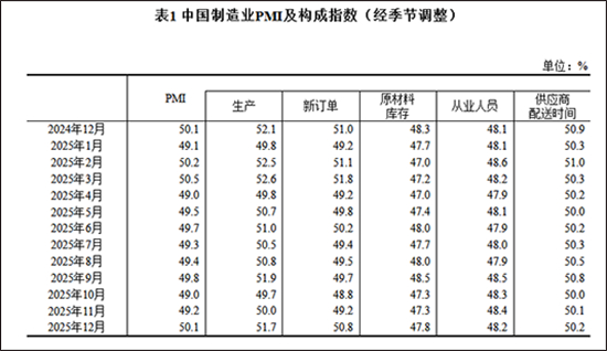 国家统计局网站消息,2025年12月中国采购经理指数(PMI)运行情况正式发布。其中,制造业PMI为50.1%,较上月回升0.9个百分点,重返扩张区间。
