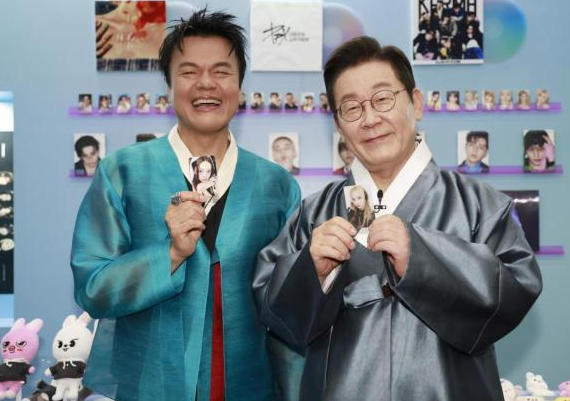 李在明和韩国JYP娱乐代表兼首席制作人朴轸永合影 韩联社