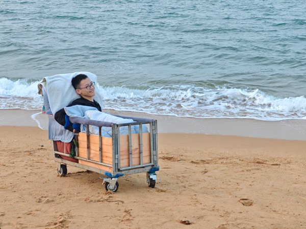 2025年12月28日,海南永庆后海,韩彬彬第一次看海,车身里的软包和束缚是他的安全铠甲,这辆照着他父亲生前焊制的模样复刻的推车2.0,也已陪他走过六七个年头。 岩思类脑供图