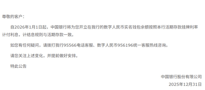12月31日,工商银行、农业银行、建设银行、交通银行、邮储银行、中国银行六大国有银行集体发布公告,宣布自2026年1月1日起,将为数字人民币实名钱包余额按照活期存款挂牌利率计付利息,计结息规则与活期存款一致。