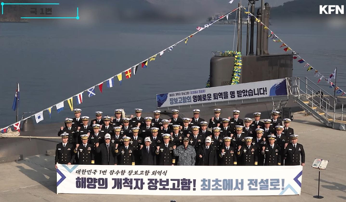 横幅上的谚文意为:“大韩民国1号潜水舰张保皋号退役仪式 海洋的开拓者张保皋号!从第一艘驶向传奇!”舷梯上的谚文意为“海洋的开拓者张保皋号!从第一艘驶向传奇!张保皋号已获准光荣退役”