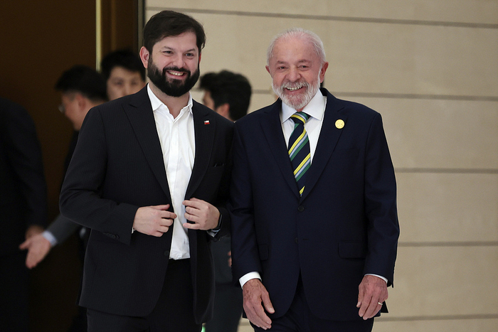 当地时间2025年5月13日,中国北京,巴西总统卢拉(右)与智利总统鲍里奇在中国CELAC论坛部长会议开幕式前聊天,准备合影。视觉中国