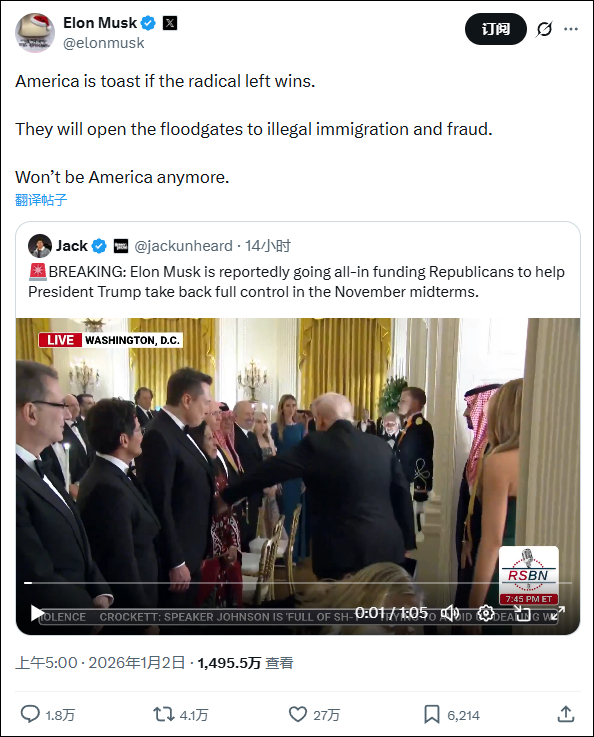 【文/观察者网 熊超然】进入2026年,美国政坛一大重头戏就是中期选举。据美国右翼保守派小报《纽约邮报》当地时间1月1日报道,一向喜欢染指政治的亿万富翁马斯克当天暗示,他将在今年中期选举前资助共和党候选人,并声称如果民主党控制国会,美国将走向毁灭。