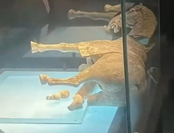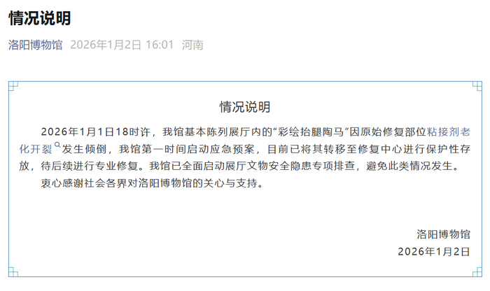 2026年1月1日18时许,我馆基本陈列展厅内的“彩绘抬腿陶马”因原始修复部位粘接剂老化开裂发生倾倒,我馆第一时间启动应急预案,目前已将其转移至修复中心进行保护性存放,待后续进行专业修复。我馆已全面启动展厅文物安全隐患专项排查,避免此类情况发生。