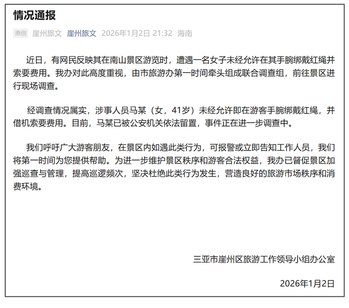 经调查情况属实,涉事人员马某(女,41岁)未经允许即在游客手腕绑戴红绳,并借机索要费用。目前,马某已被公安机关依法留置,事件正在进一步调查中。