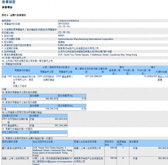 香港交易所信息显示,国家集成电路产业投资基金股份有限公司在中芯国际H股的持股比例于12月29日从4.79%升至9.25%。