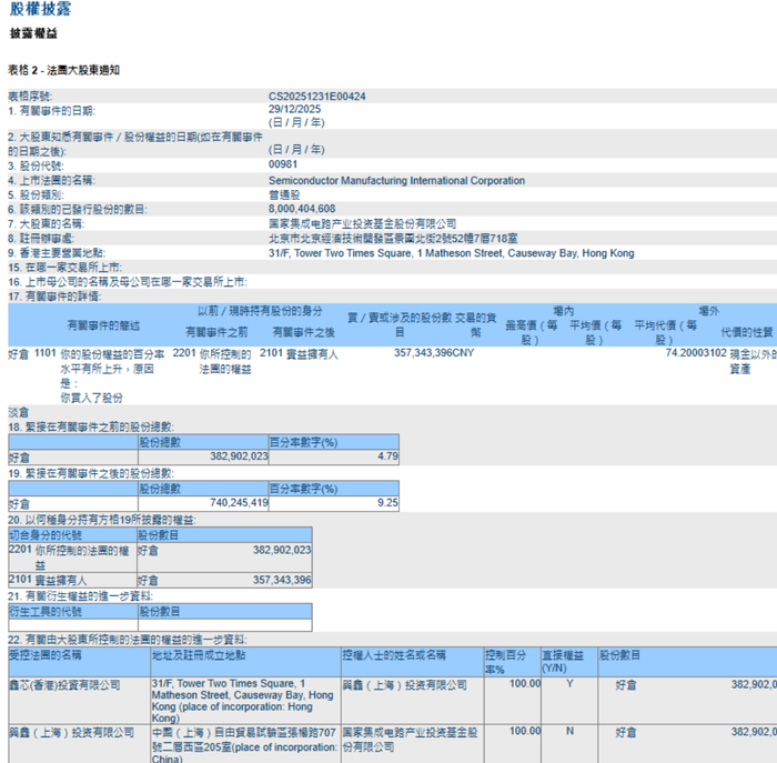 香港交易所信息显示,国家集成电路产业投资基金股份有限公司在中芯国际H股的持股比例于12月29日从4.79%升至9.25%。