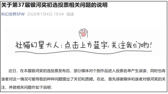 微信公众号“科幻世界SFW”1月4日消息,第37届银河奖组委会发布关于第37届银河奖初选投票相关问题的说明: