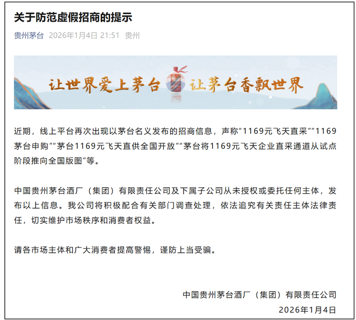 微信公众号“贵州茅台”1月4日发布关于防范虚假招商的提示: