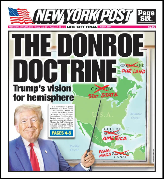 去年伊始,《纽约邮报》在头版刊登了这样一幅漫画:特朗普面带标志性的抿嘴笑容,站在一幅经过涂改的西半球地图前。版面上赫然印着标题——“唐罗主义”(Donroe Doctrine)。
