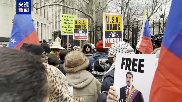 总台记者在现场看到,法院周边安保明显加强,多辆警车停靠在路口布防。民众在法院外广场及周边街道聚集,他们举着“释放马杜罗”“不要向委内瑞拉开战”等标语横幅,不时高呼口号,对美方行动表示不满。