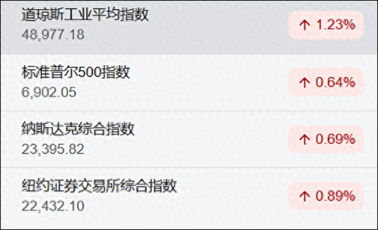 截至当日收盘,道琼斯工业平均指数大涨1.23%,报48977.18点;标准普尔500指数上涨0.64%,报6902.05点;纳斯达克综合指数同样呈现上扬态势,涨幅达0.69%,报23395.82点。此外,纽约证券交易所综合指数也表现不俗,全天上涨0.89%,报22432.10点。